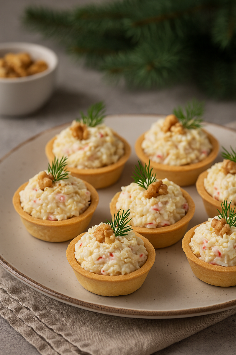 Новогодние блюда должны быть не только вкусными, но и легкими — ведь застолье обычно затягивается. Эта закуска сочетает в себе свежесть крабового мяса, кремовую нежность сыра и приятную текстуру орехов. А миниатюрные тарталетки добавляют элегантности и позволяют подать закуску порционно, без лишней суеты.