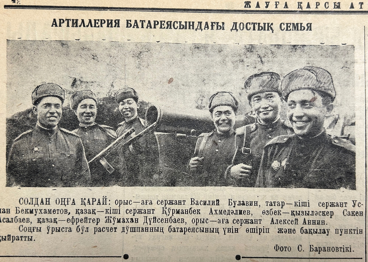 12 ноября 1944 г. фронтовая газета «Жауға қарсы аттан» опубликовала фото «Артиллерия батареясындағы достық семья» («Дружная семья артиллерийской батареи»). Подпись к снимку гласила: «Слева направо: русский – старший сержант Василий Булавин, татарин – младший сержант Усман Бекмухаметов, казах – младший сержант Курманбекк Ахмадалиев, узбек – красноармеец Сакен Асалабев, казах – ефрейтор Жумахан Дуйсенбаев, русский – старший сержант Алексей Аннин. В последнем бою этот расчет заглушил вражескую батарею и уничтожил блокпост противника».