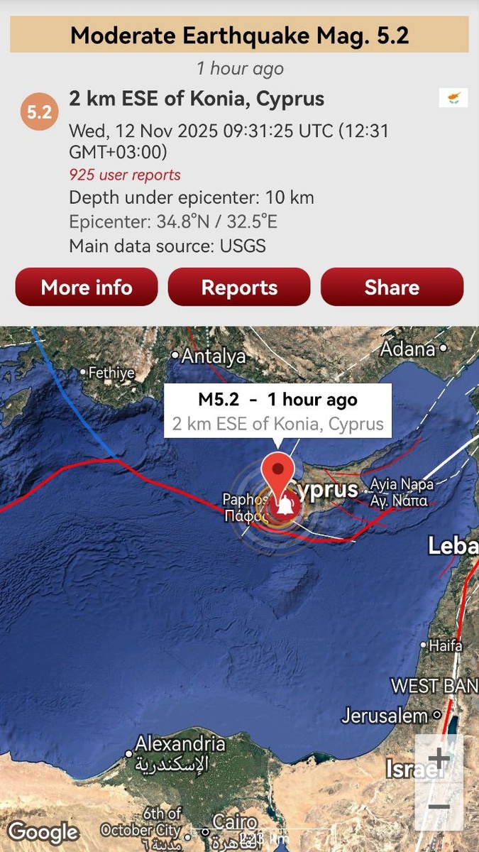 В ответ на пост Согласно вчерашнему предупреждению в этот раз досталось Кипру, на территории которого произошло умеренное землетрясение. Есть вероятность более сильной сейсмики, энергия сброшена лишь частично. ===== According to yesterday's warning, Cyprus has been hit this time, with a moderate earthquake on its territory. There is a possibility of a stronger seismic event, the energy is only partially discharged.