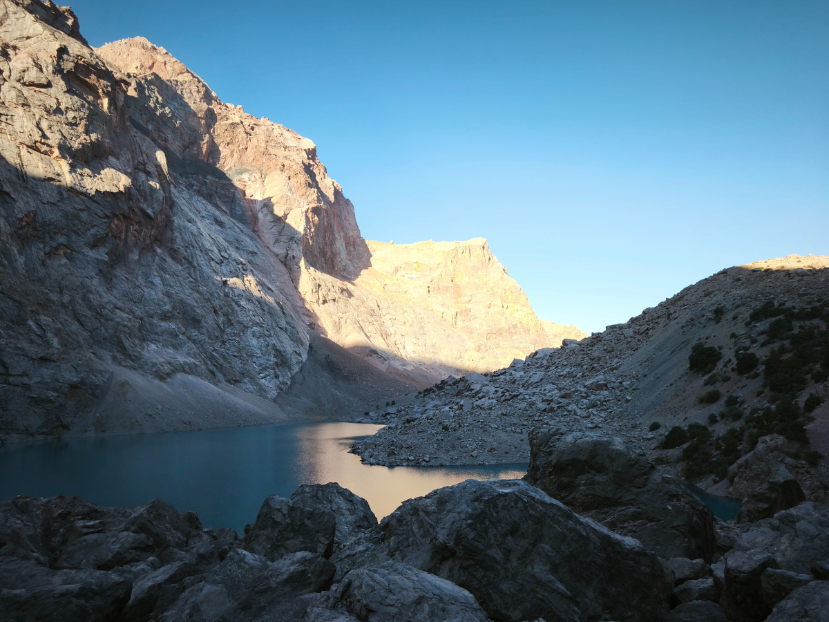 Ну, и прощаемся с этим местом Соседи тоже собираются Идём вдоль берега озера. Один вид краше другого - невозможно просто взять и перестать фотографировать Хотя на самом деле идти очень неприятно. Большая сыпуха - это когда постоянно каскадируешь с одного большого камня на другой. А за спиной рюкзак... Есть проблески тропы, но тоже там много разъезжающихся камешков под ногами - бдительность и ещё раз бдительность. Ковыряемся. Проходим под тем самым камнепадом Явно тут скоро ещё что-нибудь отвалиться. И вот мы на перевале - перед нами долина - спускаться туда!