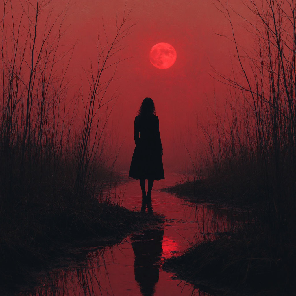 Потом подошла к холсту, который начала неделю назад. На нём — переплетение красных и белых нитей, образующих лабиринт. В центре — маленькая фигура с поднятыми руками.