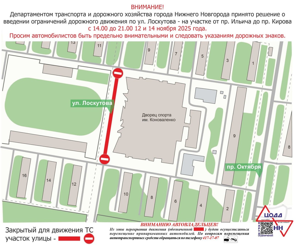 Движение транспорта по улице Лоскутова в Нижнем Новгороде будет временно ограничено 12 и 14 ноября с 14:00 до 21:00. Об этом сообщили в городской администрации.