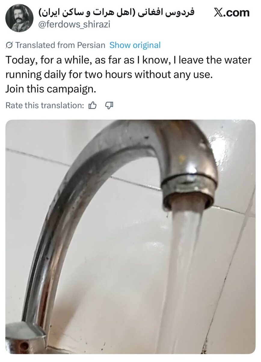 В ответ на пост "Боротьба" идиотов везде одинакова... В Тегеране оппозиция к иранскому правительству проводит протестную акцию, в виде открытия кранов с водой на 2 часа. О проблемах с водоснабжением в Иране писал ранее.