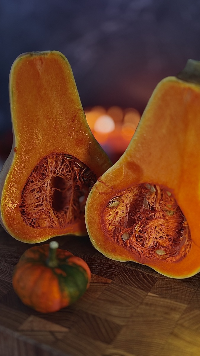 Тыква – царица осени, символ изобилия и плодородия, поражает разнообразием форм, цветов и размеров. Ее крупные, гладкие или ребристые плоды могут быть ярко-оранжевыми, желтыми, зелеными и даже белыми. Осенние краски тыквы – оранжевая мякоть, солнечный цвет, богатый каротином, и ароматная сладкая мякоть – приносят уют и тепло, а сама тыква служит источником витаминов и кулинарных возможностей. Многие недооценивают пользу тыквы и проходят мимо оранжевой богини. И зря. Ее полезные свойства обусловлены большим содержанием замедляющей всасывание углеводов клетчатки, антиоксидантов, витаминов, минералов и белка. В ней почти нет жира и крахмала. Сегодня я поделюсь с вами моим вариантом заготовки тыквы на зиму. Для начала выбираем спелую тыкву, так как чем спелее, тем она слаще и нежнее. Моем ее и разрезаем вдоль на две части. Сразу предупреждаю , что сделать это бывает не легко и если у вас есть сильный помощник, то лучше обратиться к нему. Чем больше тыква, тем сложнее ее поделить, поэт