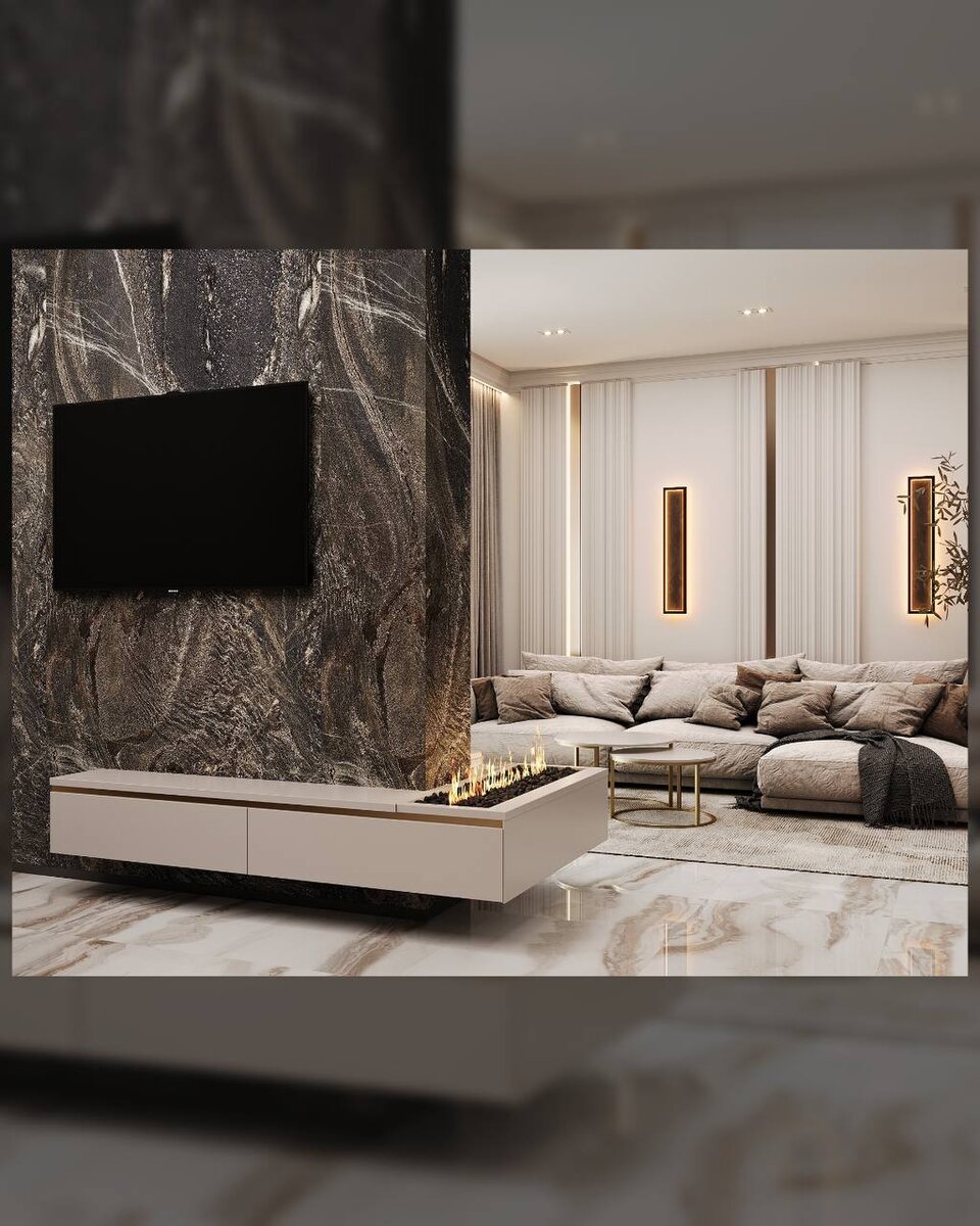 Идеальный интерьер говорит на языке эмоций, а не слов. Эскизы общей зоны в ЖК на набережной, в которых безупречная эстетика работает на ваш комфорт и статус. Темная каменная стена становится тихим драматическим акцентом, а светлая палитра и мраморный пол создают ощущение воздушности. Многоуровневый свет — не просто освещение, а сценарий для вечера: теплые бра и подсветки наполняют пространство уютом, а стеклянные перегородки позволяют ему дышать. Прикоснитесь к дизайну класса А: портфолио реализованных проектов — на сайте magentastudio.ru Magenta