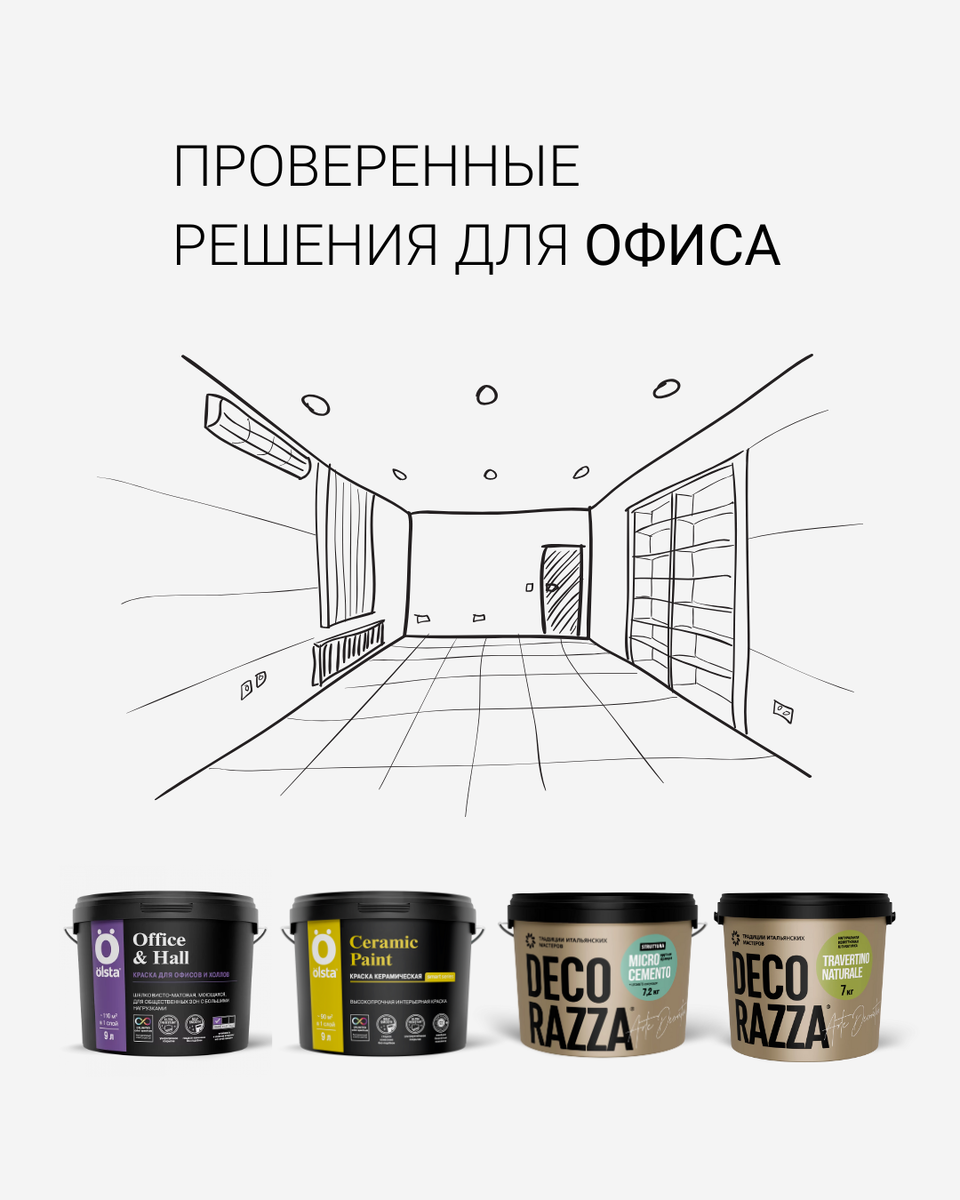 Разбираемся, какие покрытия подходят для офисных пространств, что учитывать при выборе и чем отличаются между собой решения от Olsta и Decorazza Офис – это всегда повышенная нагрузка: постоянное движение людей, частая уборка, жесткий свет и строгие требования к внешнему виду. Здесь материалы должны работать не хуже сотрудников (долго и максимально стабильно!). В этом материале – четыре покрытия, которые подходят для общественных пространств. Они отличаются по фактуре, степени защиты и области применения, но объединяет их самое важное: практичность и выверенный результат. Office and Hall – акриловая краска, разработанная специально для отделки офисов, приемных, холлов и других зон. Отличается стойкостью, быстротой нанесения и универсальной текстурой. Краска не требует идеально подготовленного основания: шелковисто-матовая поверхность скрывает мелкие дефекты и делает стены аккуратными даже без тонкой шлифовки. Прекрасно ложится без подтеков, не образует брызг и быстро разравнивается. Ols