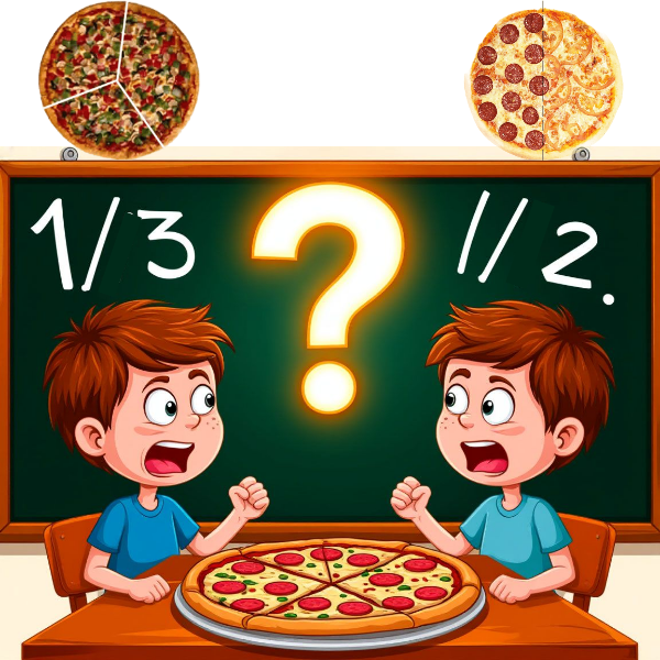 «Мама, смотри, 1/3 больше, ведь 3 же больше 2!» — ваш ребенок не пытается вас запутать. Его мозг попал в классическую математическую ловушку, где логика проигрывает визуальному обману. Давайте найдем эту «невидимую ошибку» и поставим на место все дроби раз и навсегда! Ребенок видит: в дроби 1/3 цифра «3» больше, чем «2» в дроби 1/2. Его мозг автоматически делает вывод: «Раз число внизу больше, значит, и дробь больше». Это главный обман! Это самая мощная ловушка. Если нарисовать пиццу, разрезанную на 2 части, и пиццу, разрезанную на 3 части, то один кусок из трех визуально кажется больше. Но это разные пиццы! А нужно делить одно и то же целое. Способ 1: Метод общего знаменателя (Золотой стандарт)
