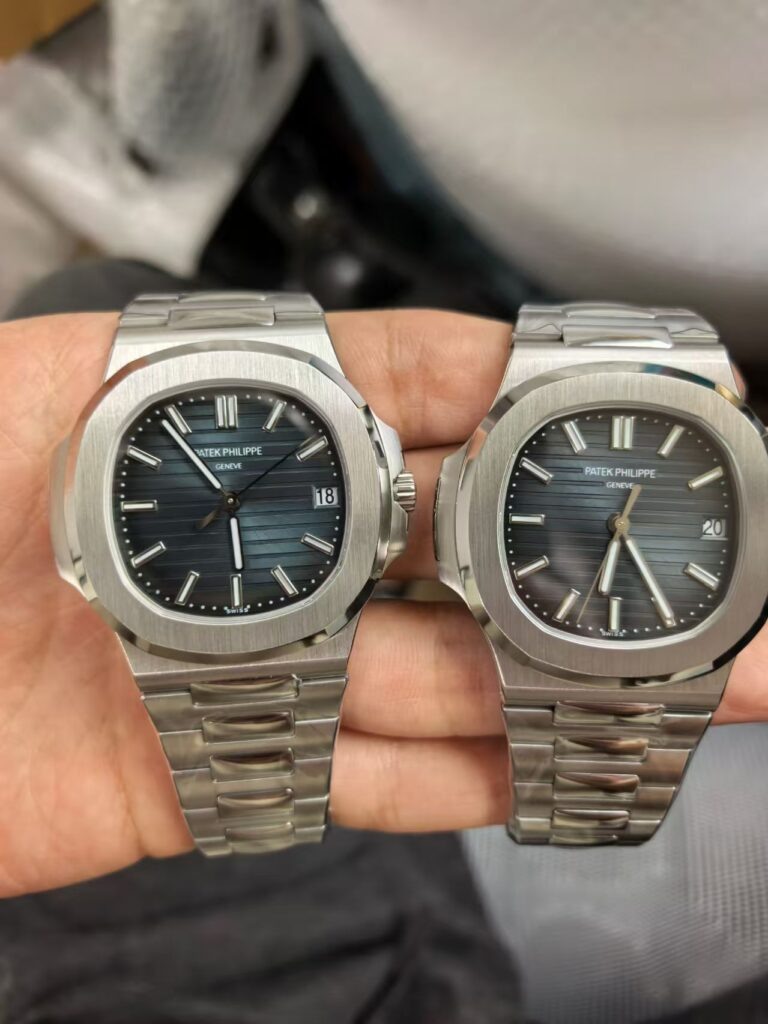 Компания BBF относительно недавно выпускает клон Patek Philippe Nautilus 5711. Ранее я уже писал про BBF. Они получили клон калибра 324 и внесли некоторые улучшения, например, цвет циферблата стал ближе к оригинальному, а гравировка на платинах механизма стала глубже. 3K Factory пока не предприняла никаких действий в отношении этих моделей. В последние годы эта фабрика была заметно менее активна, в конце концов, они много заработали, сохраняя за собой эксклюзивное право на использование механизма 324 в течение многих лет. Всего несколько дней назад BBF внесла ещё одно улучшение в циферблат. Сравнение старой и новую версии на фотографии ниже. Слева — старая версия BBF, выпущенная ранее, справа — новая версия BBF, выпущенная несколько дней назад. Разница только в циферблате. Обратите внимание на надписи «PATEK PHILIPPE» и «GENEVE». В старой версии «PATEK PHILIPPE» и «GENEVE» расположены на двух отдельных сетках, а в новой версии логотип трапециевидный, два символа расположены по центру в