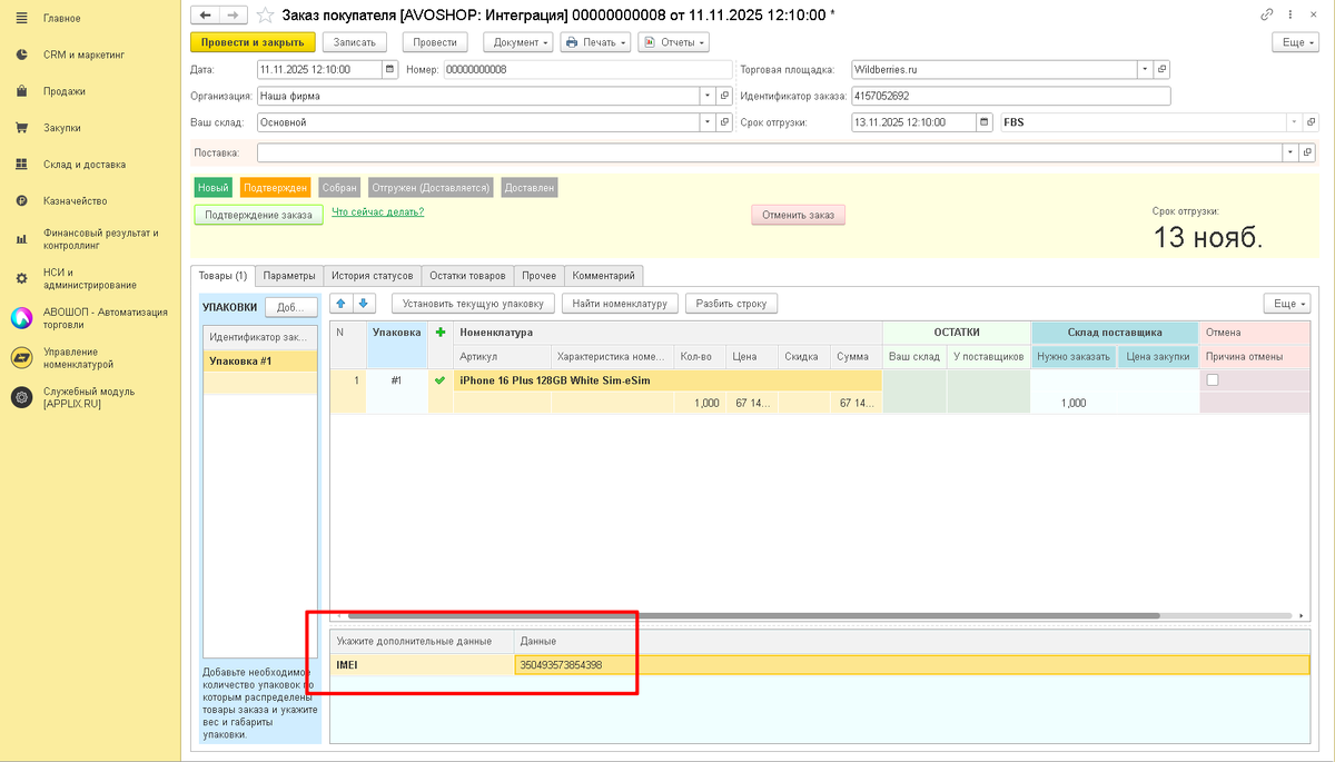 IMEI для товаров (сотовые телефоны и тд) сейчас обязателен на ВБ. В Обновлении 10.2.8Добавлена возможность передавать IMEI товара при обмене заказами с WILDBERRIES