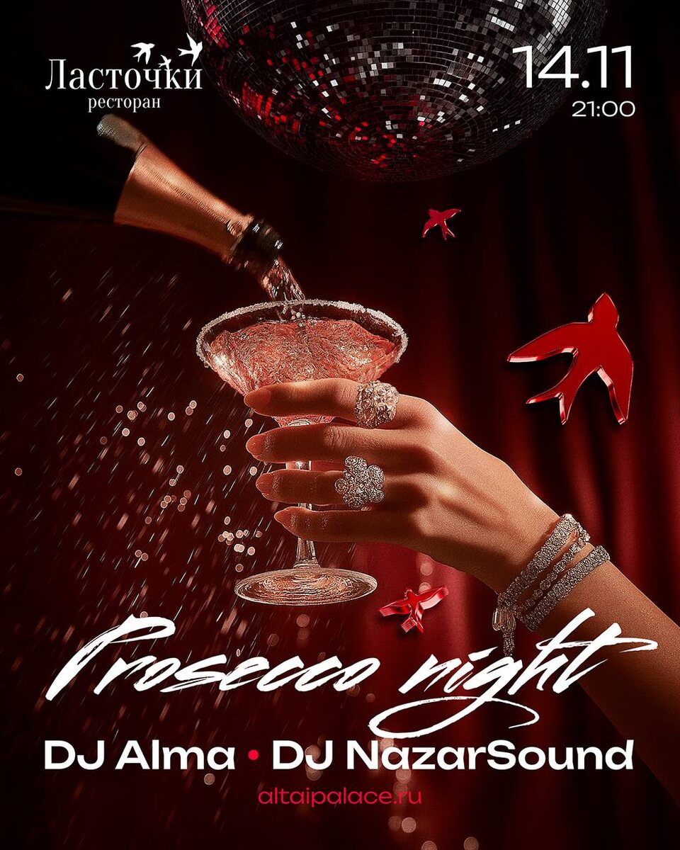 Prosecco night 🍸 Волшебная пятница под бокалы игристого намечается на курорте Altai Palace! Смех, танцы, веселье, громкая музыка, разговоры до утра, нескончаемые бокалы игристого и ВЫ ✨ В эту ночь за диджейским пультом гостей ждет DJ Alma и DJ NazarSound 🎧 ▫️ 14 ноября ▫️ 21:00 ▫️ Ресторан «Ласточки» ▫️ Бронь столов: 8-914-059-88-16
