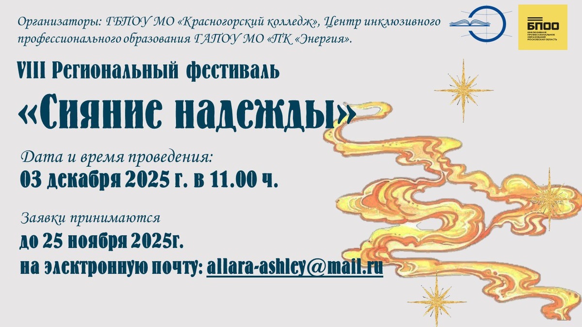 ГБПОУ МО "Красногорский колледж" совместно с Центром инклюзивного профессионального образования ГАПОУ МО "ПК "Энергия" с радостью объявляет о старте приёма заявок на VIII Региональный фестиваль "Сияние надежды"!