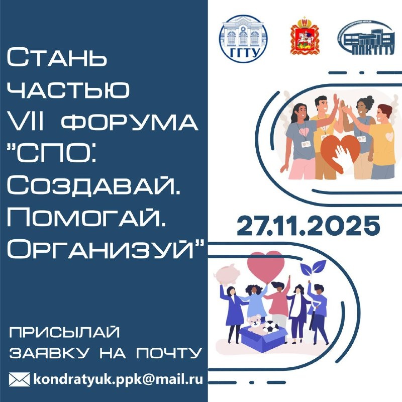 Заместитель директора по УВР ППК ГГТУ – Кондратюк Татьяна Николаевна kondratyuk.ppk@mail.ru ЗАЯВКИ необходимо выслать до 25.11.2025 г. включительно на электронный адрес kondratyuk.ppk@mail.ru с пометкой «Форум Создавай. Помогай. Организуй»-2025.