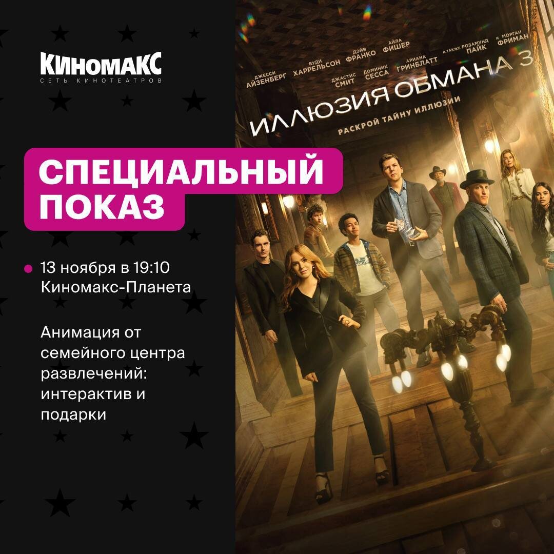 Приглашаю на специальный показ долгожданного фильма «Иллюзия обмана 3». Хотите магии? Приходите 13 ноября в 19:10 в кинотеатр «Киномакс», где узнаете предсказание от гадалки, поучаствуете в чудесном интерактиве от семейного парка развлечений и, возможно, станете счастливчиком в розыгрыше подарков. ⠀ Описание фильма⬇️ Четыре Всадника возвращаются вместе с новым поколением иллюзионистов, демонстрируя головокружительные трюки, превращения, сюрпризы и магию, каких еще не видел мир. ⠀ Билеты по ссылке https://kinomax.ru/order/3266585