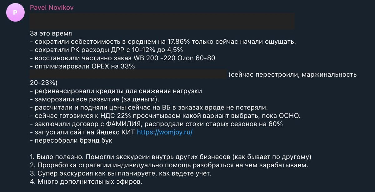 Оборот есть, денег нет. Исправляем это - на результатах моих ребят Если коротко, что происходит на маркетплейсах у большинства: деньги «утекают» в рекламу, логистику и хаос процессов. Ниже - живые кейсы моего наставничества. Скрины приложил к посту, листайте. Максим (товарка) «Раскачал продажи усилителя через внутренний трафик. Внедрил подход 10Х, выстроил процесс тестирования гипотез, контентная воронка стала системной. Нейросети - из теории превратились в инструмент. Комьюнити и поддержка - сильные». Алексей (инструменты) «За сентябрь чистая прибыль >1 млн ₽ при обороте ~4,5 млн ₽, маржинальность около 25%. Забрал из наставничества: анализ по 10Х, работа с контентом, нейросети, увидел изнутри, как у нас выстроены процессы и взаимодействия. Понял, сколько даёт работа с состоянием руководителя». Павел (одежда) — сократили себестоимость в среднем на −17,86%; — расходы на рекламу ДРР с 10–12% → 4,5%; — Восстановили заказы (ежедневно WB 200–220, Ozon 60–80); — OPEX −33%; — распродали