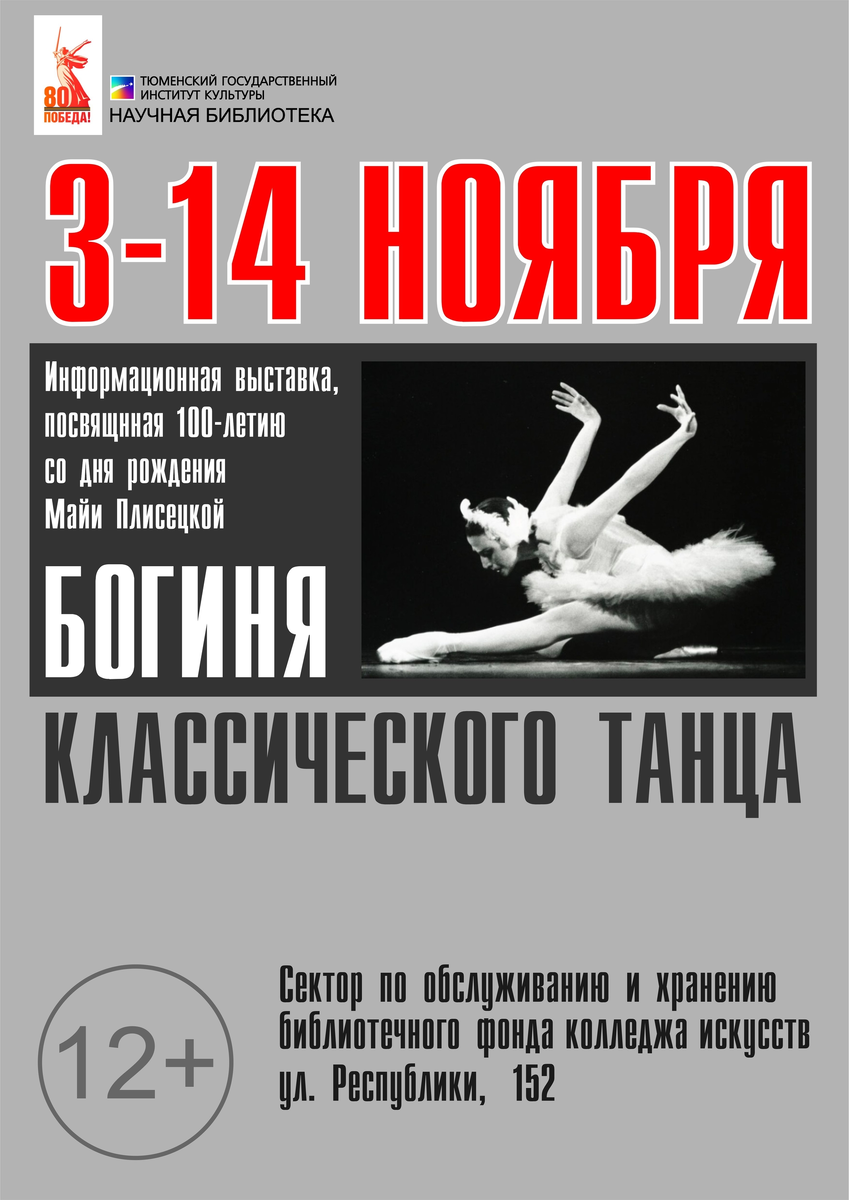 В читальном зале колледжа искусств (ул. Республики, 152, ауд. 1103) научной библиотеки ТГИК открыта информационная выставка «Богиня классического танца», посвящённая 100-летию со дня рождения советской и российской балерины Майи Плисецкой (1925–2015).