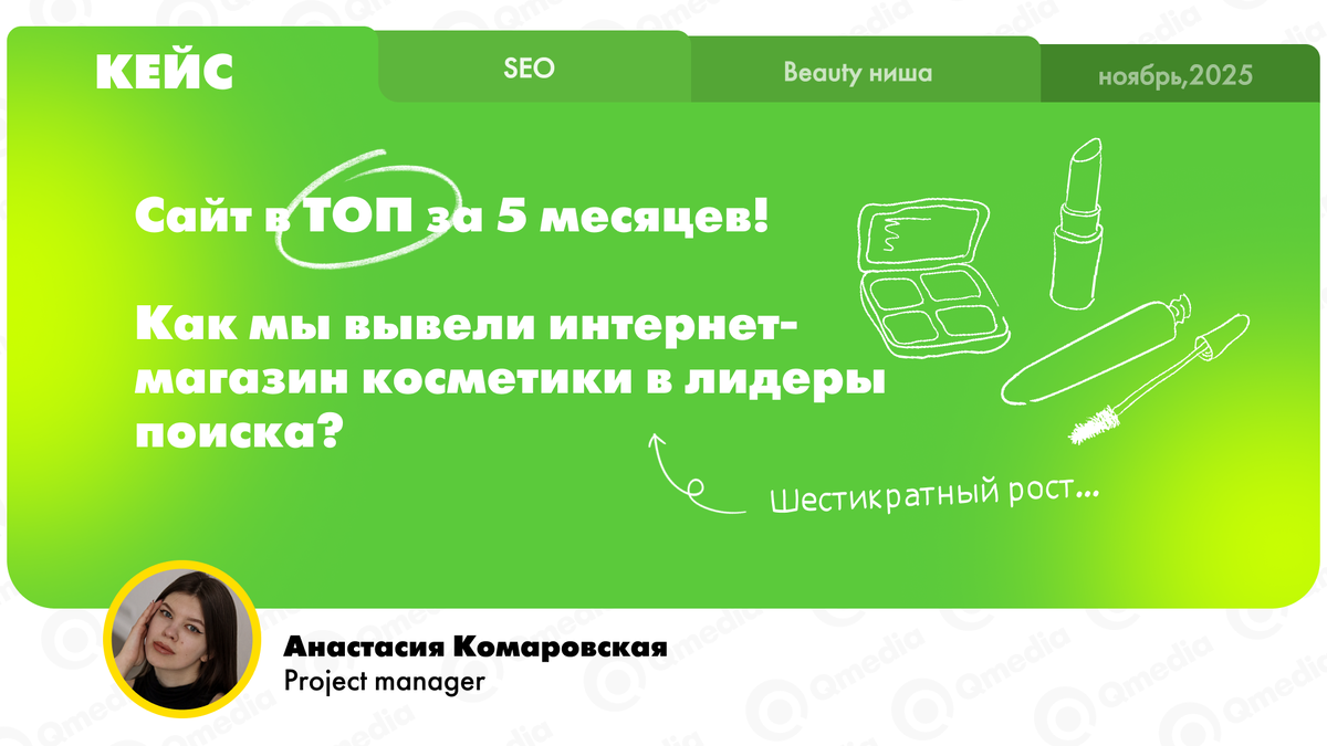 - Появиться в поисковой выдаче Google и Яндекс по таким высоко- и среднечастотным запросам, как «купить косметику», «интернет-магазин косметики», «косметика для кожи тела» и т. д.