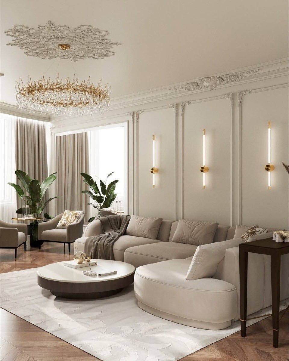 ✨ Элегантное пространство для вдохновения и умиротворения Гостиная, где мягкость и благородство соединяются в идеальной пропорции. Тёплые бежевые тона, лепнина с тонким рельефом, акценты золота и хрусталя — всё здесь создано для ощущения утончённого покоя. Эта комната словно дышит светом и воздухом, приглашая замедлиться, насладиться красотой линий и гармонией форм 🤍