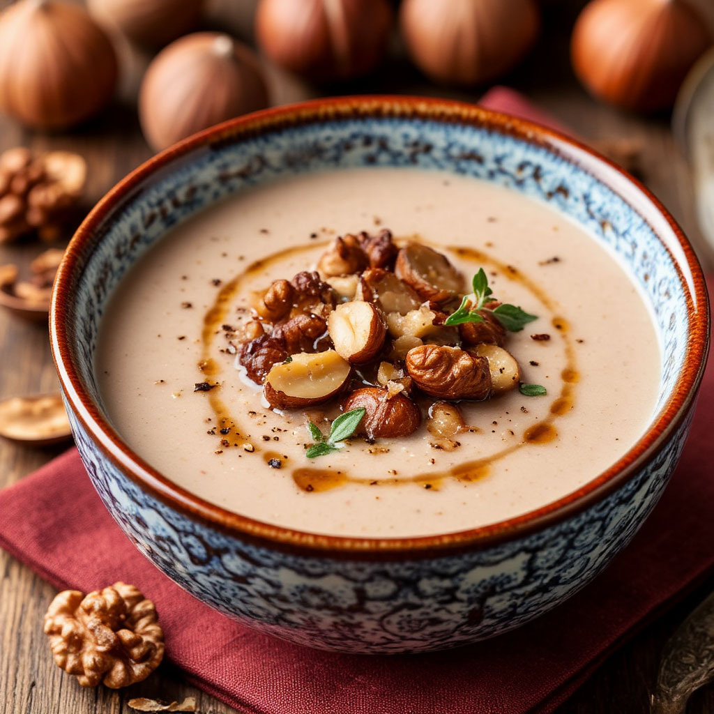 Количество порций: 3-4 Основные: Специи и ароматика: Для подачи (по желанию): Если вы используете готовые очищенные каштаны, этот шаг можно пропустить. Разлейте горячий суп по тарелкам. Перед подачей можно: Приятного аппетита! Этот благородный суп непременно согреет вас и порадует своим глубоким осенним вкусом.
