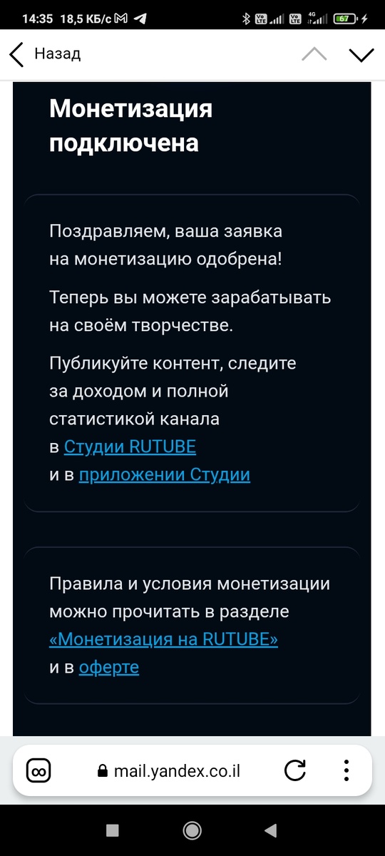 Недавно я писала статью о направлении заявки на подключение монетизации на своем канале «Привет, дача!» на rutube. Заявку на монетизацию там можно направить, выполнив всего одно условие - набрав 5000 просмотров. Как только я набрала нужное количество сразу подала заявку. На дзене я читала статьи некоторых авторов, что одобрение заявки затягивается, и что они обращаются в техподдержку. Я решила тоже написать, так как с момента отправления заявки прошел почти месяц. Что мне понравилось, что моему обращению сразу присвоили номер и взяли в работу. Ответы от поддержки были оперативные, единственная проблема была в том, что в рабочее время мне отвечать на запросы поддержки было некогда, а вечерами у нас стабильно отключают интернет, поэтому были задержки с моей стороны. И вот вчера вечером пока работал интернет, я сделала те рекомендации, которые получила от поддержки. Мне нужно было в описании своего канала на rutube указать ссылки на другие социальные сети, а в описании каналов в други