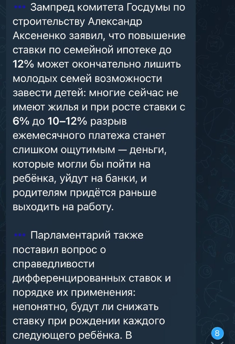 А вот Александр Аксененко не хочет подсчитать сколько семей отказались заводить ребенка потому что откладывали на квартиру годами, а льготная ипотека превратила все их сбережения в машиноместо вместо квартиры? Или может быть подсчитать сколько людей теперь даже не думают начинать откладывать средства и отказались от детей полностью? Самая же главная проблема в другом. Семейная ипотека в теперешнем виде привела к чему? К тому что семьи скопив минимум ПВ (а то и без ПВ вовсе), кинулись скупать однушки и студии, в надежде расширится в будущем. Завели ребенка, думали выставить однушку на продажу и купить двушку попозже. Когда это попозже наступило и жить с ребенком в однушке стало проблематично, а планы, может быть и на второго ребенка, а там неплохо бы и третьего, выяснился нюанс. Нюанс о котором ни Александр с коллегами из Госдумы, ни застройщики, ни банки, ни риэлторы не предупреждали. Продать они свою однушку могут только дешевле, чем покупали, и еще останутся должны банку. Соответст