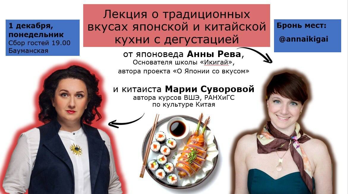 Друзья, приглашаю на лекцию- дегустацию 🇯🇵СУШИ С УТКОЙ ПО-ПЕКИНСКИ🇨🇳 Абсолютный эксклюзив! ⭐Лекция от двух востоковедов из Москвы и Петербурга с дегустацией японских и китайских закусок и десертов! Москва и Питер. Китай и Япония. Две разные кухни. Две разные вселенные. Один незабываемый вечер! С нами в этот вечер: 🎙АННА РЕВА (Петербург) – переводчик, гид и преподаватель японского языка, основатель школы «Икигаи», автор лекционного проекта «О Японии со вкусом», спикер киноцентра «Ленфильм». 🥢Сравним японскую и китайскую кухню и разберемся, если ли в них что-то общее, кроме риса и палочек? Узнаем о 🥢философии китайской и японской кухни как отражении мировоззрения, 🥢показателях мастерства поваров, 🥢табу и столовом этикете, 🥢самых странных и опасных блюдах, Развеем мифы о якобы «японских» роллах и объясним, почему китайской кухни как таковой... не существует! 🎁Каждого гостя ждет целая коробка вкусностей! Онигири от знаменитого японского шеф-повара, моти, маринованные яйц