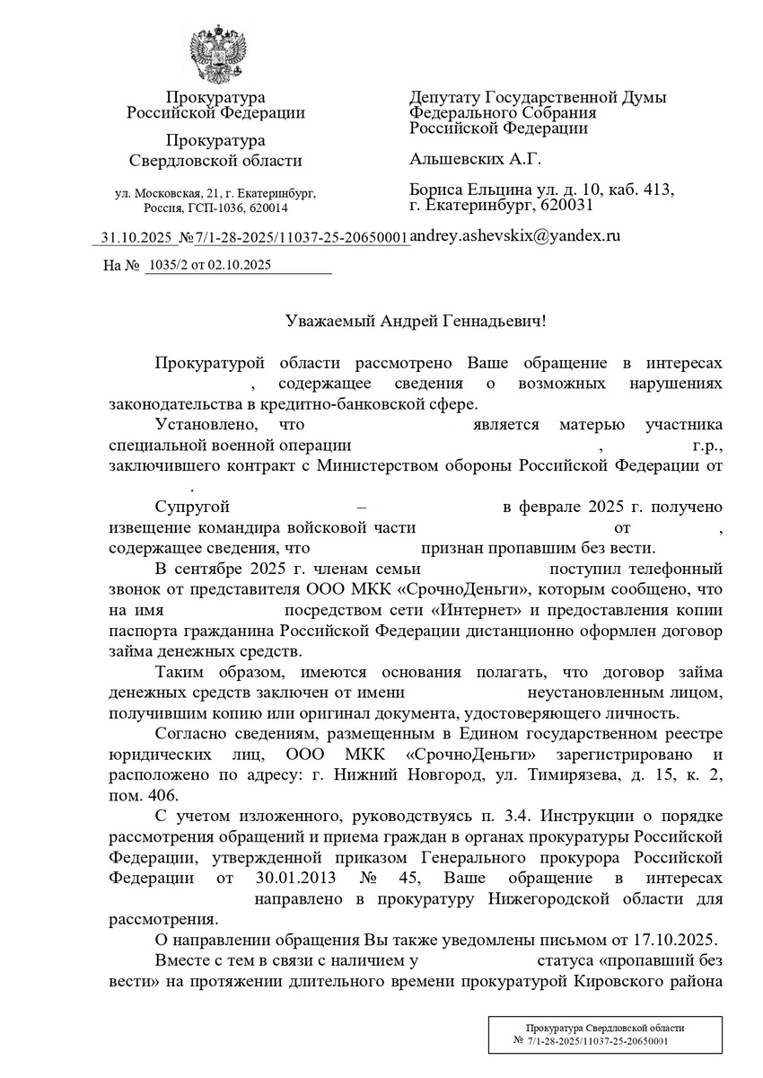 Земляк из Свердловской области пропал без вести в конце января 2025-го. Спустя несколько месяцев семью одолели коллекторы. Представители микрофинансовой организации утверждали, что в первых числах текущего года мужчина оформил кредит через Интернет. Близкие считают, что заявку подали мошенники, и просят установить виновных.