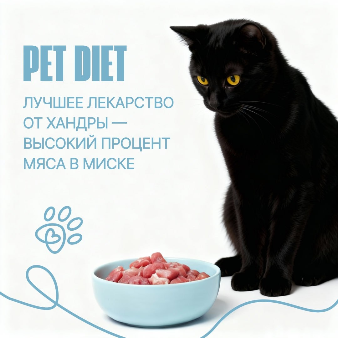 🐾 Когда ваш пушистик вдруг потерял интерес к играм, стал меньше мяукать или просто «зависает» на диване - возможно, это не просто отдых, а лёгкая хандра. А лучшее средство от неё - наполнить миску тем, что ему действительно нужно: питанием, которое ему необходимо по природе. 👉 Кошки - плотоядные животные. Для них мясо - не просто еда, а источник энергии, здоровья и хорошего настроения. Поэтому в нашем натуральном питании мы используем настоящее рубленое мясо и субпродукты, без мясокостной муки и искусственных добавок. 💡 Почему «высокий процент мяса в миске» - это лучшее лекарство от хандры: Мясо содержит аминокислоты, витамины и минералы, которые поддерживают нервную систему и обмен веществ. Натуральные ингредиенты легче усваиваются, снижают нагрузку на ЖКТ - а значит, меньше дискомфорта и больше активности. Когда рацион приближен к природному, кошка чувствует себя увереннее, становится подвижнее и любопытнее. Пробиотики и пребиотики в составе помогают поддерживать микрофлору