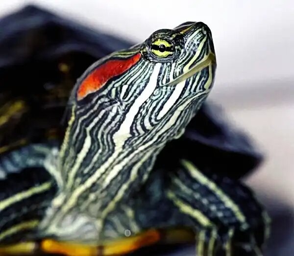 Красноухая черепаха (Trachemys scripta elegans) — подвид болотной черепахи, родом из юго-востока США. Ее отличительная черта — яркие красные пятна за глазами, особенно заметные у молодых особей. Панцирь у малышей — насыщенно зеленый с желтыми полосами, но со временем он темнеет, а контрастность снижается.