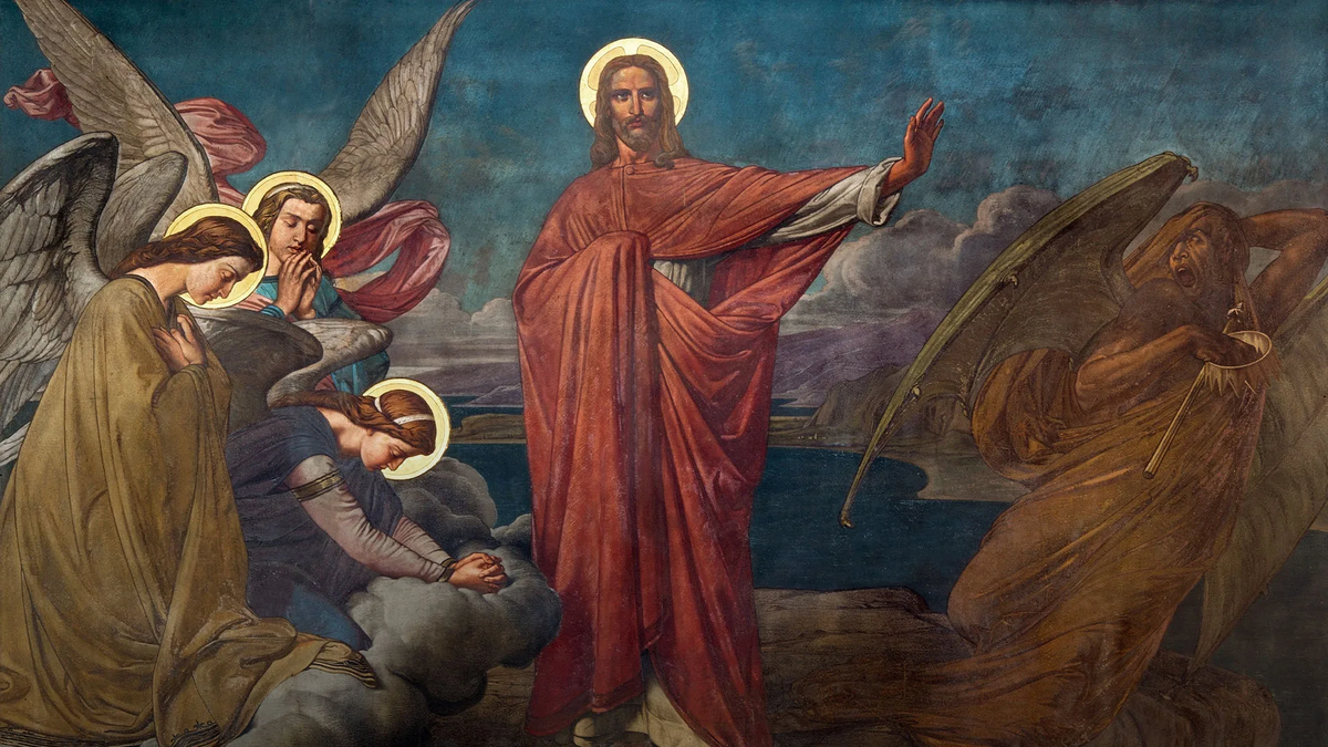 Христос неколебим в своём выборе. Небесное воинство - не столько "группа поддержки", сколько наглядное обозначение сил света, а Сатана-искуситель жалеет, что пытался искушать.