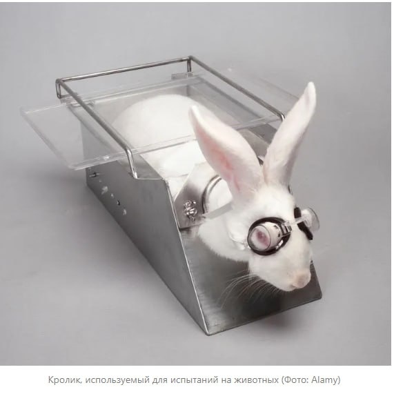 Фото к аудио о том, что до сих пор фарма и косметика продолжает тестировать свои вещества на животных. Вот свежее фото устройства с кроликом для тестирования геля. В эти очечки заливают шампунь и смотрят как долго продержится радужка