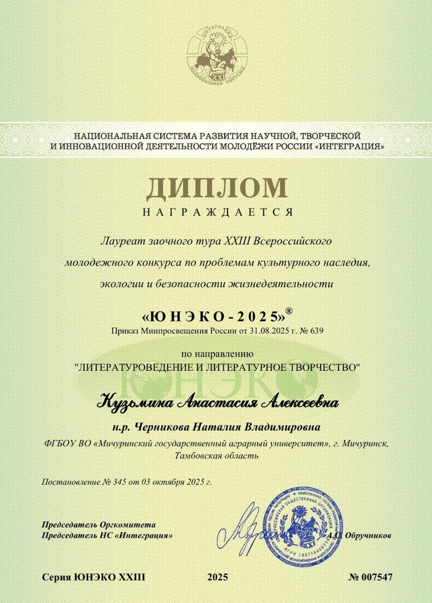 Обучающиеся Социально-педагогического института Мичуринского ГАУ Анастасия Кузьмина и Людмила Бубнова приняли участие во Всероссийском молодежном конкурсе «ЮНЭКО», посвящённом проблемам культурного наследия, экологии и безопасности жизнедеятельности. Под научным руководством профессора кафедры социально-гуманитарных дисциплин Наталии Черниковой студентки представили работы в номинациях «Лингвистика» и «Литературное творчество и литературоведение». За высокий уровень конкурсных проектов Анастасия и Людмила были награждены Дипломами лауреатов заочного тура. #МичуринскийГАУ