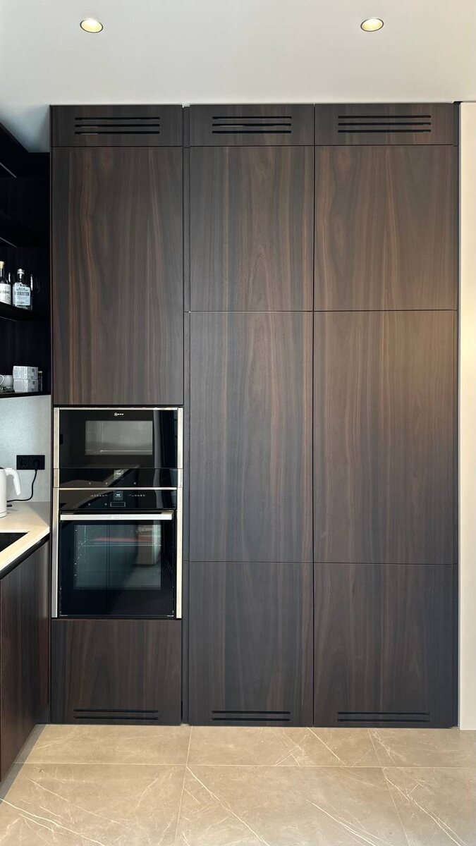 Мореный шпон хранит время Он рождается не сразу — древесину медленно сушат, выдерживают, дают ей покой. >> В процессе шпон темнеет, становится плотным, чуть бархатным на ощупь. Так появляется плотность и глубина оттенка, будто в ней растворено движение лет. В кухне проекта River Sky этот материал звучит особенно точно: темное дерево уравновешивает свет и металл, собирая пространство в одну линию ~ В этом посте есть большое видео, которое не загрузилось в Дзен. Откройте оригинал поста в телеграме, чтобы его посмотреть