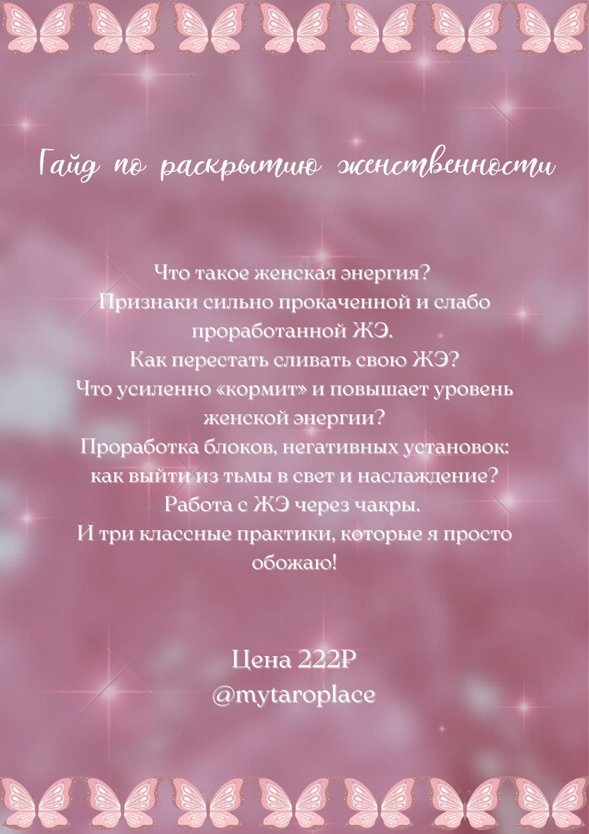Звёздочки, сегодня не просто обычный день, пятница, а день Венеры! Для тех, кто хочет максимально погрузиться в эту тему: раскрыть свою сексуальность, ловить взгляды мужчин, получать подарки, вырасти в доходе – предлагаю свой гайд! Наполнение на картинке. Почувствуй свою женскую силу и давай начнем это чудесное путешествие вместе! Ценность гайда (более 20 страниц) по очень доступной цене 222₽. Приобрести можно у меня в личных сообщения в телеграм @asytaro❤️