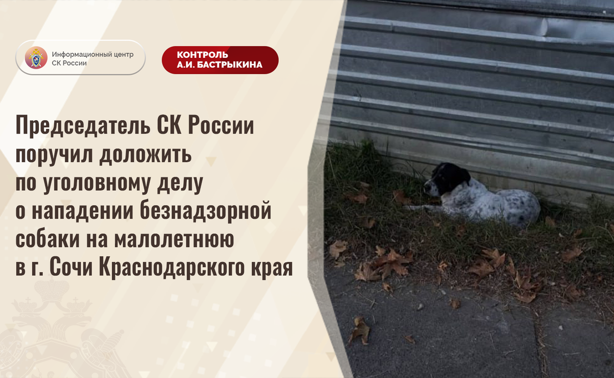 Председатель СК России поручил доложить по уголовному делу о нападении безнадзорной собаки на малолетнюю в г. Сочи Краснодарского края В социальной сети сообщается, что 9 ноября текущего года в городе Сочи Краснодарского края безнадзорная собака набросилась на девятилетнюю девочку, укусив за ногу и руку. Пострадавшей потребовалась медицинская помощь. Отмечается, что ранее агрессивное животное также нападало на детей, однако мер к организации ее отлова не принято. В СУ СК России по Краснодарскому краю возбуждено уголовное дело. Председатель Следственного комитета Российской Федерации Александр Иванович Бастрыкин поручил руководителю СУ СК России по Краснодарскому краю Андрею Константиновичу Маслову доложить о ходе и результатах расследования уголовного дела. Исполнение поручения поставлено на контроль в центральном аппарате ведомства. #СледственныйКомитет #СКРоссии #СКР #ИЦСКР #ИнформационныйЦентр #АлександрБастрыкин #ПредседательСКР #КонтрольПредседателяСКР #КомментарийКонтроль #Красн