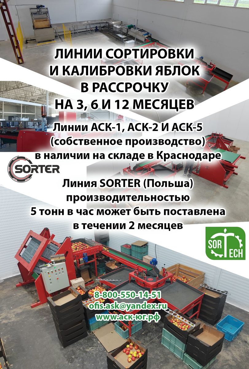 Теперь современные технологии стали еще доступнее! ООО «АСК-ЮГ» предоставляет уникальную возможность приобрести профессиональное оборудование для сортировки и калибровки яблок с гибкими условиями рассрочки. 💰 Варианты рассрочки: 3 месяца 6 месяцев 12 месяцев 🚀 Готовы к отгрузке со склада в Краснодаре Линии собственного производства: АСК-1 (до 2,5 т/ч) – идеально для небольших хозяйств АСК-2 (до 4 т/ч) – с двумя калибровочными столами АСК-5 (до 5 т/ч) – высокая производительность 🌍 Премиальное решение: Линия SORTER (Польша) производительностью до 5 т/ч – поставка в течение 2 месяцев ✅ Почему выбирают нас: Собственное производство в России Европейское качество SORTER Доставка и монтаж "под ключ" Гарантия и сервисное обслуживание 📞 Узнайте подробности о рассрочке: Телефон: 8-800-550-14-51 Email: ofis.ask@yandex.ru #АСКЮГ #Рассрочка #СортировкаЯблок #КалибровкаЯблок ООО «АСК-ЮГ» – инвестируйте в технологии без ущерба для бюджета!