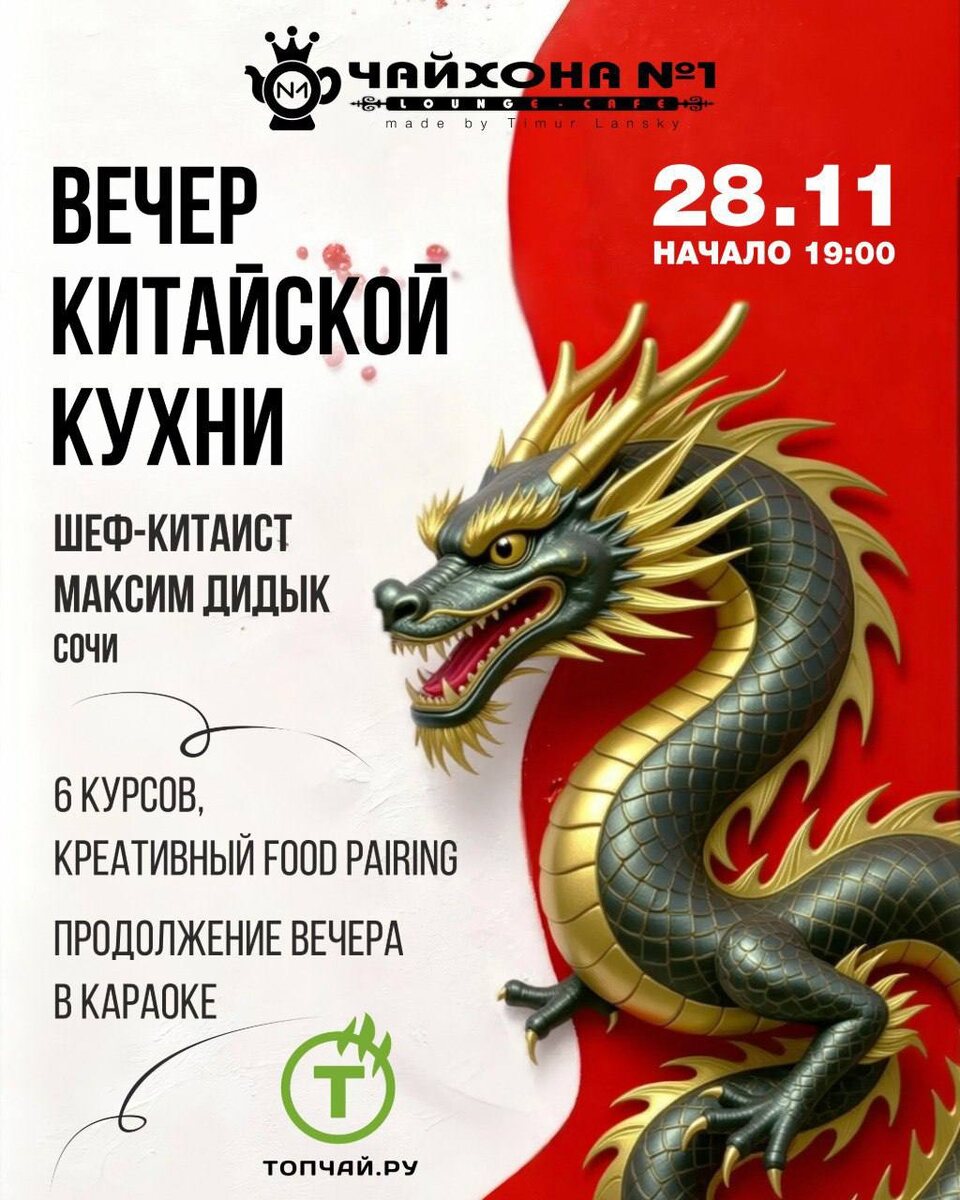 Вечер китайской кухни | Чайхона №1 28.11 | 19:00 🇨🇳Шеф-китаист Максим Дидык приглашает на гастроужин. Вас ждет 6 курсов блюд и авторский фуд-пейринг. Познакомимся с Восточной Азией? Вам будут представлены: ✦ Грибы Эноки кимчи, арахис, чили, пряный лук ✦ Битые огурцы сыр тофу, жареный угорь ✦ Хрустящий ролл курица карри, древесные грибы, имбирный соус ✦ Хрустящий карп кисло-сладкий соус, шпинат, проростки сои ✦ Утиная грудка по-пекински пак чой, соус хойсин ✦ Моти малина, крем из алоэ 🍸Каждое блюдо будет дополнено изысканными напитками для идеального гастрономического сочетания. 🎤Завершим прекрасный вечер в нашем караоке-зале. 🫖 А еще проведем дегустацию китайских элитных сортов чая. Вечер обещает быть насыщенным! Количество мест ограничено, скорее бронируйте билет: +7(846)255-04-09 С алкогольным сопровождением: 4900 руб/чел Безалкогольное сопровождение: 4500 руб/чел