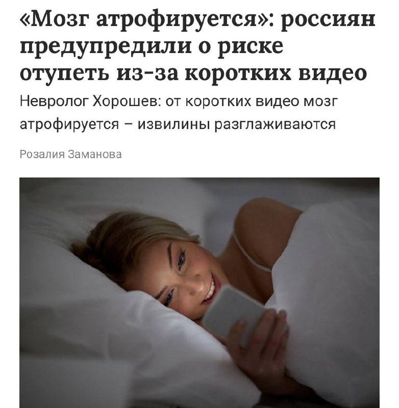 Рилсы вредят мозгу: безопасное время просмотра — 2–3 минуты. По мнению врачей, постоянный просмотр рилсов может привести к атрофии коры головного мозга и «разглаживанию» извилин. ────────── ⚡️Важные новости – без лишнего шума!⚡️ Подпишись на канал и получай только суть: оперативно, чётко, по делу! 👉 ИнфоСплетник | @infospletnik