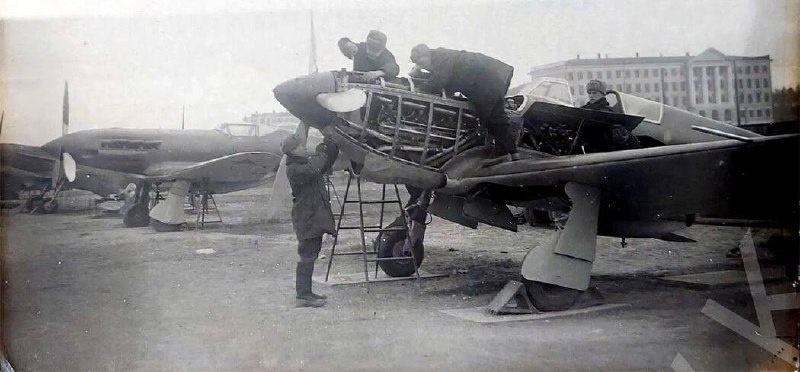 Свердловск. Военные самолёты в районе перекрестка улиц Первомайской - Кузбасской (ныне Гагарина) 📸Фото 1942 год. В кадр попали два здания: Суворовское училище (Первомайская, 88) и корпус УПИ (Мира, 17).