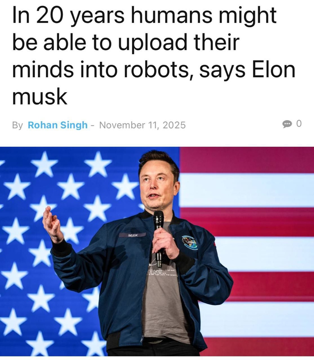 👌 Илон Маск заявил, что через 20 лет станет возможным перенос человеческого сознания в роботов. Он активно работает над созданием гуманоидов, которые будут предназначены для загрузки личности, памяти и идентичности человека. По словам Маска, получившаяся копия будет практически неотличима от оригинала и сможет работать с помощью технологии Neuralink, которая уже позволяет управлять устройствами силой мысли.