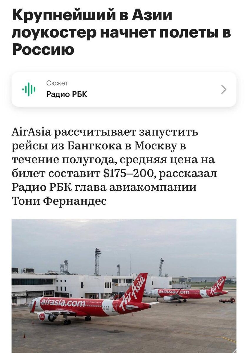 Летать в Азию станет втрое дешевле — AirAsia запустит прямой рейс Москва–Бангкок с билетами от 16 тысяч рублей, почти втрое ниже нынешних цен. Авиакомпания уже подбирает самолёты и оформляет документы, первый вылет ожидается весной или летом. Источник