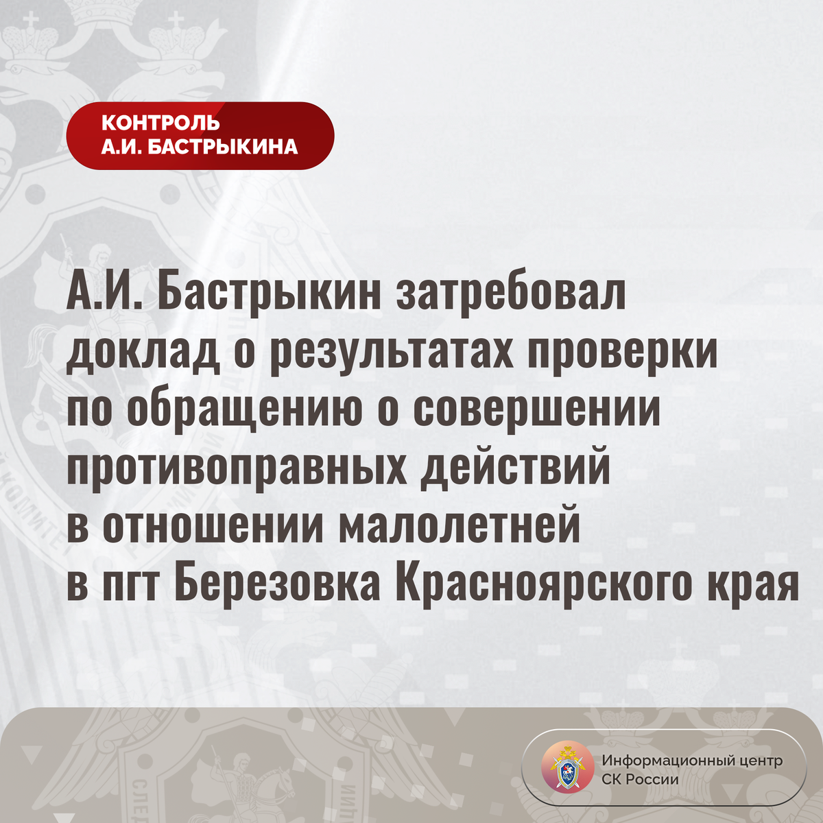 А.И. Бастрыкин затребовал доклад о результатах проверки по обращению о совершении противоправных действий в отношении малолетней в пгт Березовка Красноярского края К Председателю СК России А.И. Бастрыкину через Информационный центр обратилась жительница Красноярского края по вопросу совершения противоправных действий в отношении ее 13-летней дочери в поселке городского типа Березовка. В ноябре текущего года во дворе одного из образовательных учреждений девочку избили сверстники. Пострадавшей потребовалась медицинская помощь. Мать школьницы опасается, что виновные могут избежать ответственности. В ГСУ СК России по Красноярскому краю и Республике Хакасии по поступившему обращению организована процессуальная проверка. Председатель Следственного комитета Российской Федерации Александр Иванович Бастрыкин затребовал у руководителя ГСУ СК России по Красноярскому краю и Республике Хакасии Алексея Леонидовича Еремина доклад о ходе и результатах процессуальной проверки. Исполнение поручения, а