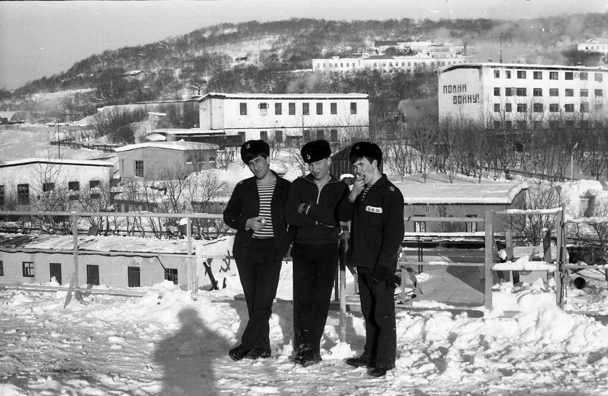 Матросы чистят от снега крышу узла связи(?). Дело происходит в Североморске. Часть 2. С 1980 года на погончиках матросов размещается литера Ф. Источник: отсканированная плёнка из личной коллекции. #плёнка #ВМФ #Северный_флот #СФ #матросы