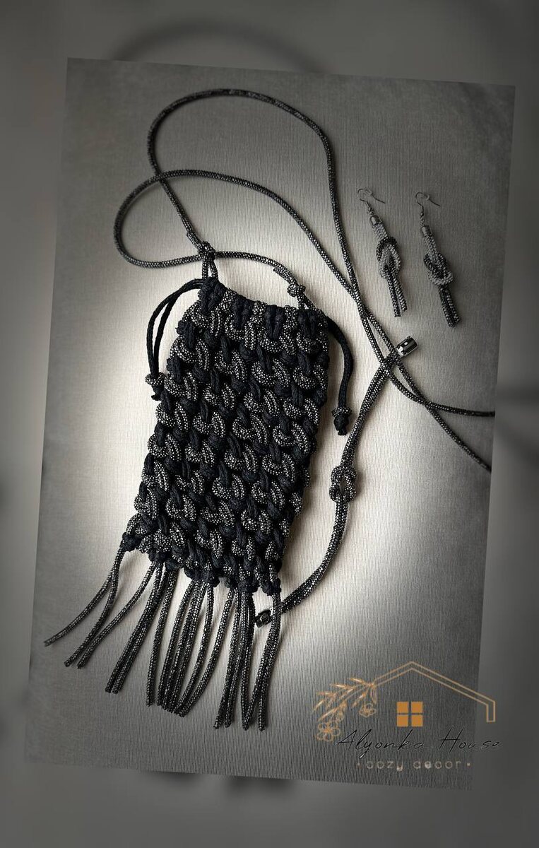 ✨ Театралочка или корпоративочка — это стильный комплект, который отлично украсит ваш образ. Сумочка для телефона, выполненная в технике макраме из двух видов шнуров — стразового и полиэфирного, так же станет удобным и функциональным аксессуаром для театра или корпоративного мероприятия. ✨Позвольте себе сиять! А я с радостью помогу вам в этом! Стучите в «Алёнкин домик»🏠 Пишите @evs2470 ✍️ #украшенияручнойработы #подаркиручнойработы #алёнкаплетёт #стразовыйшнур #подарокдлялюбимой #макраме #сумкимакраме