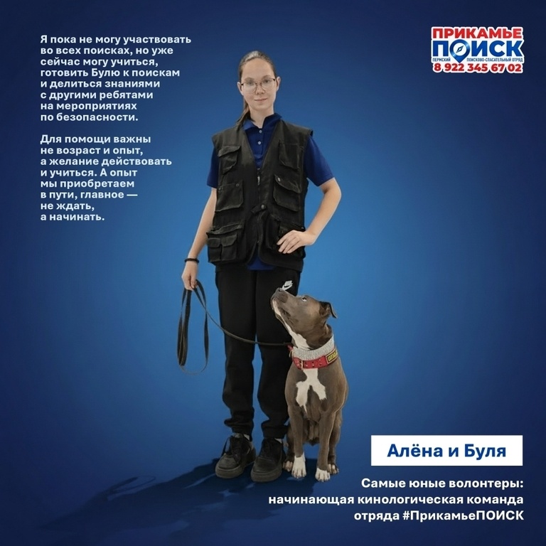 Знакомьтесь с Аленой и Булей: юные, начинающие, но уже важная часть нашей команды! В нашем отряде #ПрикамьеПОИСК есть волонтеры, которые доказывают: чтобы помогать людям, не нужно ждать совершеннолетия. Достаточно горящего сердца и желания действовать. Сегодня расскажем об Алене и ее собаке Буле. Алене всего 15, но ее целеустремленности можно позавидовать. Вместе с Булей они активно готовятся к поисковой работе: изучают теорию, отрабатывают команды, учатся читать местность. И это не просто увлечение — это осознанный путь к спасению жизней. «Я понимаю,что не могу пока участвовать во всех поисках. — говорит Алёна. — Но я могу учиться сейчас. Могу готовить Булю к работе. А еще — делиться тем, что уже знаю. После участия в мероприятиях по профилактике пропажи детей в рамках проекта "Флаги безопасности", где я рассказывала о том, как работают поисковые собаки, несколько ребят задумались о кинологии. Это здорово! Значит, наша работа уже дает результаты». Мы в отряде видим, как серьезно