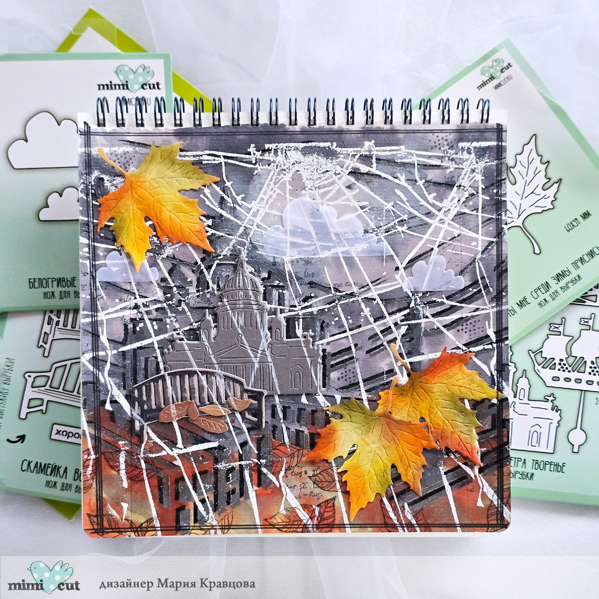 Погода нам досталась очень разнообразная: и пасмурно, и дождливо, и даже солнечно было. Гуляя по городу, обратила внимание, что много мест, где на газонах лежит осенняя листва. И это такие красивые пятна в сером и хмуром дне. А еще, очень здорово наблюдать за дождем из окна теплой и уютной комнаты. Там мокро, серо, холодно, люди и машины спешат укрыться от дождя, а ты сидишь, пьешь вкусный чай, смотришь как капли на стекле собираются в струйки и стекают по окну вниз. Кайф. Эта поездка и стала моим вдохновением. В создании странички мне помогали наборы ножей для вырубки от MimiCut - товары для скрапбукинга "Скамейка воспоминаний", "Белогривые лошадки", "Ты мне среди зимы приснись", "Люблю тебя, Петра творенье", "Любящее сердце" (из рамки вырезала мелкие листья для скамейки) и набор штампов и ножей для вырубки "Весна в душе". P.S. Мне давно не давал покоя этот