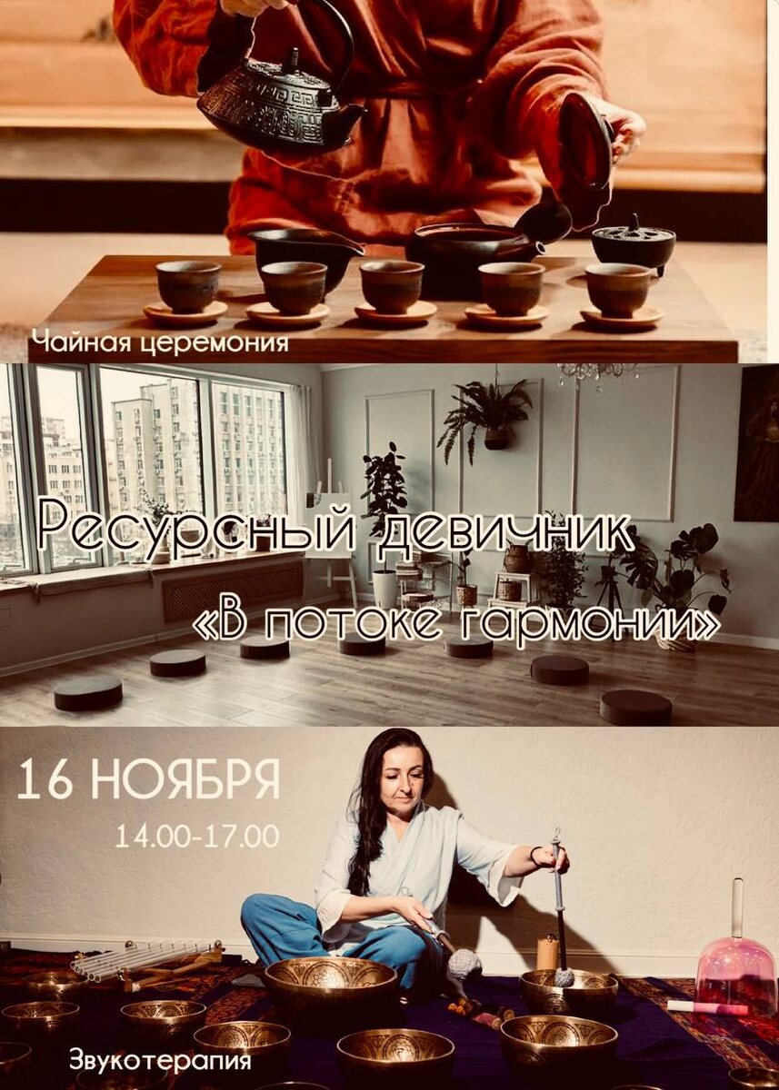 Девочки, у нас есть приятные изменения в программе на ресурсный девичник ♠️♠️♠️♠️♠️♠️♠️♠️ ✨Погружение в Гармонию Звука и Чайной Церемонии✨ 📸будет ещё фотосессия, лепестки, свечи - невероятно волшебная атмосфера✨ Это будет невероятный день, наполненный нежными вибрациями, умиротворяющими звуками и теплыми, искренними беседами. 🧘♀️Это девичник, где каждая из вас сможет отдохнуть от суеты, наполниться женской энергией и обрести внутреннюю гармонию. Что вас ждет: ☕️ Чайная Церемония: ✨Это теплое время для душевных бесед, обмена женскими вибрациями и новых знакомств ✨Вы познакомитесь с тонкими нюансами вкуса и аромата редких сортов чая, узнаете о традициях и культуре чаепития (приглашенный эксперт Андрей из чайного кунг-фу клуба) 🥣 Церемония Поющих Чаш ✨Уникальная 1,5 часовая звуковая медитация, где волшебные звуки тибетских поющих чаш окутают вас, снимая напряжение и погружая в состояние глубокого расслабления. ✨Вы почувствуете, как вибрации чаш проходят сквозь тело, очищая от н