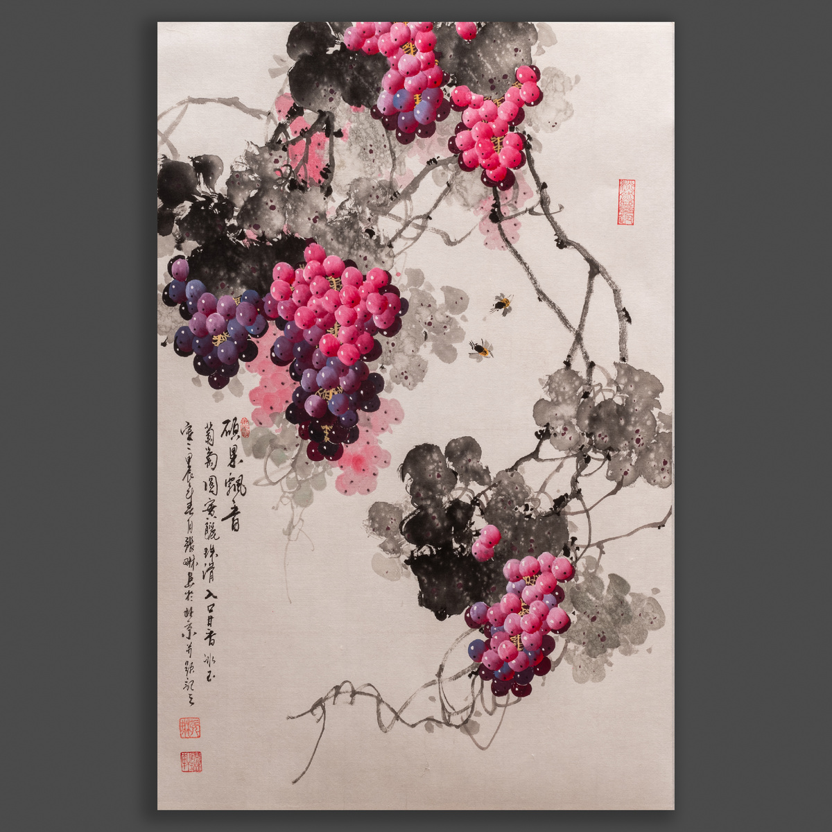Вокруг винограда — две пчёлы. Они не случайны. В китайской символике пчела означает труд, гармонию, взаимное движение природы и человека. Здесь они придают композиции дыхание и ритм. Но самое важное в этих работах — не цвет и не линия.
