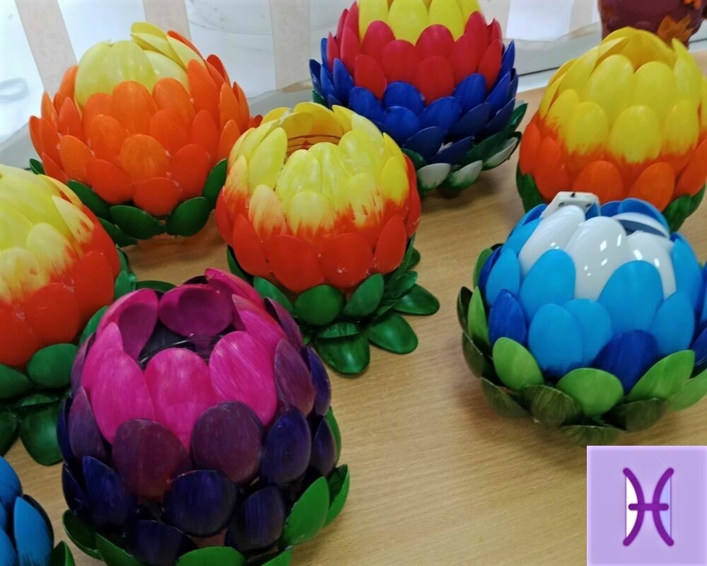 Всем привет. В прошлой публикации я рассказывала, о мастер классе по изготовлению цветов из изолона. Сегодня же хочу рассказать о другом мастер классе. Это изготовление светильников ночников. Этот мастер класс проходил на базе комплексного центра социального обслуживания населения. Все отдыхающие там, это женщины, как сейчас принято говорить, серебряного возраста. Многие приняли участие в этом увлекательном занятии. Итак, рассказываю. Для изготовления светильника потребуется небольшая стеклянная банка, 40 - 50 штук пластиковых ложек, краски и лак. И самое главное, чтобы это всё-таки был светильник, нужно запастись небольшой светодиодной гирляндой, которая называется “Роса”. Гирлянда работает от батарейки. Так как пластиковые одноразовые ложки исключительно в белом цвете (во всяком случае я других не встречала), то, конечно же, чтобы светильник был ярким пятном в интерьере, их нужно покрасить. Раскрашивали ложки акриловыми красками за 2, а то и 3 раза, для равномерного окрашивания. Ког