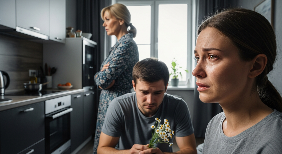 В этот момент вернулся Олег. Он услышал крики с лестничной площадки и замер на пороге, глядя то на плачущую мать, то на жену с пылающим лицом.