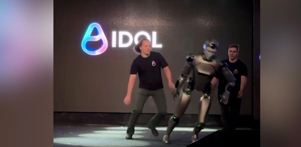 Наверное, этот AIdol рождён от знаменитого рогозинского робота Фёдора. Причем, обратите внимание, вывели робота под музыку из американского фильма «Рокки», не под какого-нибудь «Шамана» (мы такое нескрепное явление всецело одобряем).